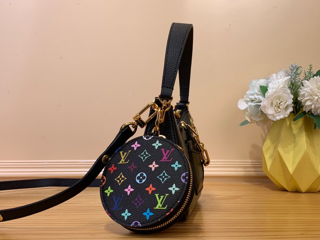 この黒いルイ・ヴィトンのハンドバッグは、リッチなエピ・レザーで作られており、スマートフォンやその他の日用品を収納するのに十分なスペースを備えた洗練された構造になっています。ラウンド型の小銭入れとミラーは、ルイ・ヴィトン×村上コラボシリーズのカラフルなモノグラム・キャンバスを使用し、武骨な金属チェーンでバッグ本体に固定されています。